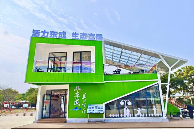 在东成诚信文化广场建设圩镇美丽客厅,建筑面积约350平方米,一楼设东成优品等展陈区与阅览区,二楼引进饮品商家入驻经营,打造书香与咖啡香共鸣、清风伴思想齐飞的阅读休闲角。形成集圩镇文化展示、市民休闲、娱乐等功能于一体的特色区域,丰富居民休闲娱乐方式与精神文化生活。